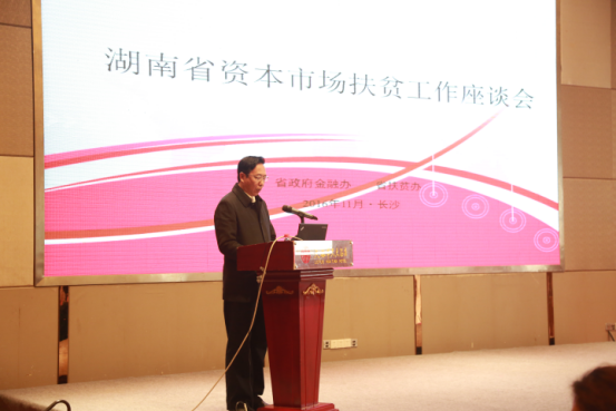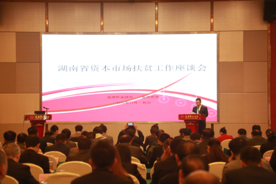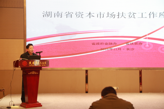 11月3日上午,由省政府金融办和省扶贫办联合主办的湖南省资本市场扶贫工作座谈会在长沙举办。省扶贫办主任王志群、省政府金融办副主任张立东、省政府金融办副主任张新青、省国资委副主任樊建军,省环保厅、省国资委、省地税局、省工商局、省国税局、湖南证监局相关负责人,各市州金融办、扶贫办负责人,我省国家级贫困县和集中连片特殊困难地区县县政府负责人,县金融办、扶贫办负责人,省内有关证券公司、拟上市企业共200余人参加了本次座谈会。