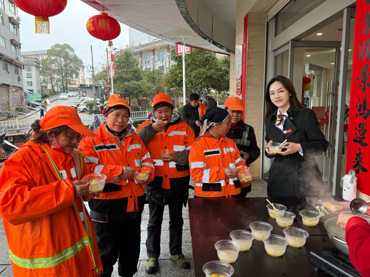 随着一线环卫工人陆续到来,工作人员热情地迎上前,将一碗碗热气腾腾的汤圆送到他们手中,并递上暖心的节日祝福。长沙银行通道支行相关负责人表示,此次活动既是对环卫工人默默奉献的致敬,也是长行“暖心金融”服务理念的生动实践。作为扎根侗乡的金融机构,长沙银行通道支行始终秉持“服务地方、服务中小、服务市民”的宗旨,在深耕金融主业的同时,积极投身公益事业,持续开展关爱老人、帮扶学子、慰问一线工作者等活动,用实际行动传递金融温度。