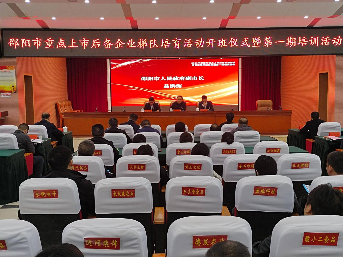 11月11日,2025年邵阳市重点上市后备企业梯队培育活动开班仪式暨第一期培训在邵阳经开区举行,副市长易洪海、财信金控集团副总经理钟荣华参加,市政府秘书长唐宏华主持。
