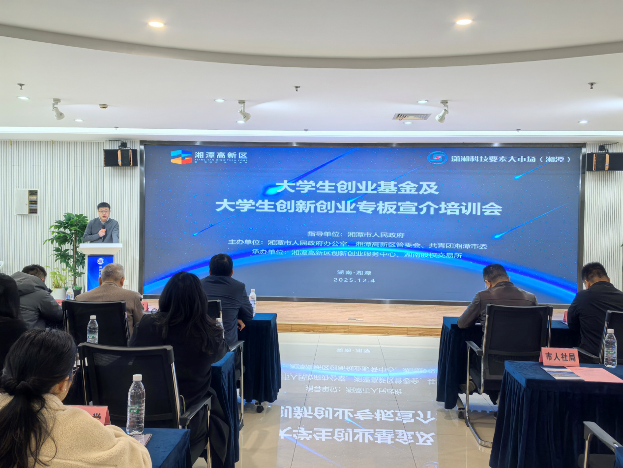 12月4日,由湘潭市人民政府指导,湘潭市人民政府办公室、湘潭高新区管委会、共青团湘潭市委主办,湖南股权交易所和湘潭高新区创新创业服务中心承办的湘潭“大学生创业基金及大学生创新创业专板宣介培训会”在湘潭高新区创新大厦附楼潇湘科技要素大市场(湘潭)一楼路演厅成功举办,驻潭高校负责人及大学生科技园入园企业、湘潭市大学生创业成果大赛项目负责人等近百人参加。