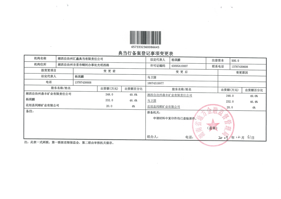 变更后股权结构为:湘西自治州鼎丰矿业有限责任公司出资额248万元,占注册资本的49.6%;花垣县同顺矿业有限公司出资额20万元,占注册资本的4%;马卫国出资额232万元,占注册资本的46.4%。