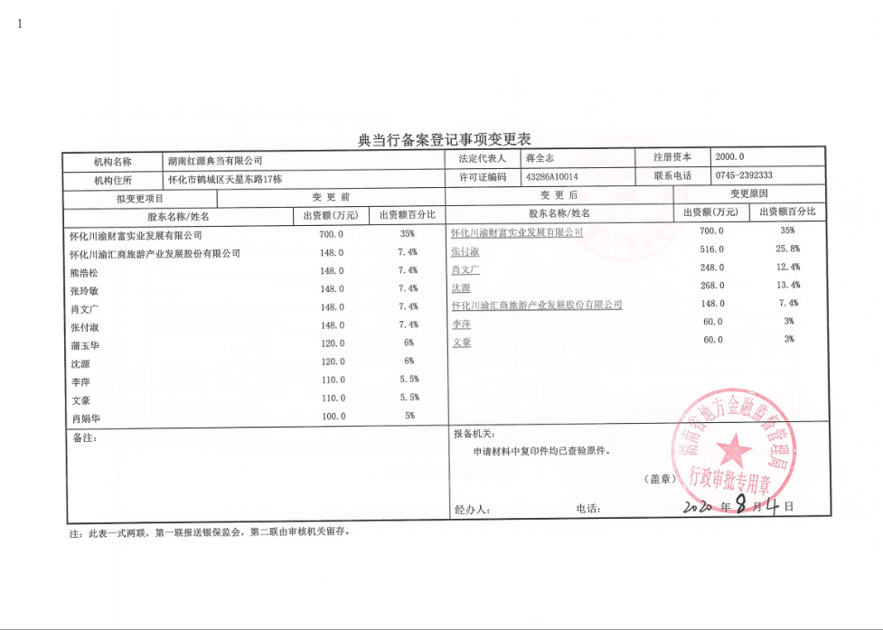 你公司上报的变更申请报告及相关材料收悉。根据《典当管理办法》和《公司法》有关法律法规的规定及怀化市人民政府金融工作办公室的初审意见,经审核,现批复如下: