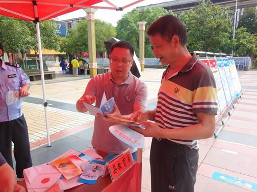 图为县公安局工作人员为群众发放防范非法集资资料和小礼品。