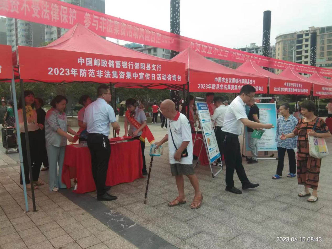 为增强群众的法制观念,提高群众对非法集资的识别能力和防范意识,从源头上防范化解非法集资的风险隐患,按照省市统一安排,6月15日邵阳县开展2023年防范非法集资集中宣传日活动,邵阳县政府金融办、县金融服务中心、县公安局经侦大队、县民政局、县检察院、县法院及县内各金融机构等相关成员单位参加。