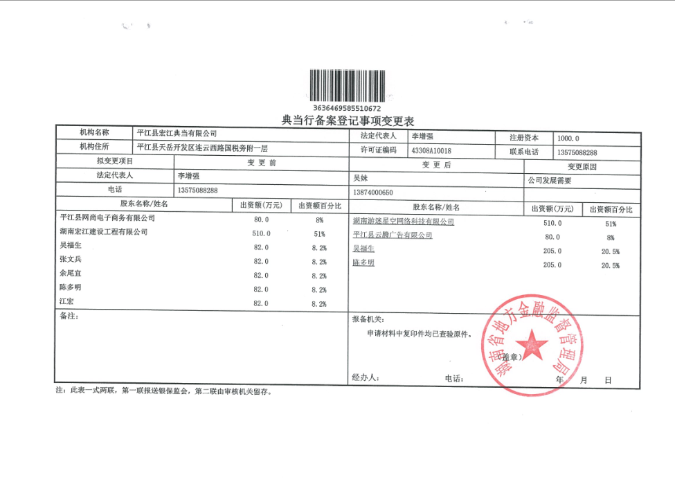 二、同意原法人股东湖南宏江建设工程有限公司持有的510万元出资额,占51%的股份全部转让给湖南迷游星空网络科技有限公司;原法人股东平江县网尚电子商务有限公司持有的80万元出资额,占8%的股份全部转让给平江县云腾广告有限公司;原自然人股东江宏持有的82万元出资额,占8.2%的股份全部转让给吴福生;原自然人股东张文兵持有的41万元出资额,占4.1%的股份转让给吴福生,持有的41万元出资额,占4.1%的股份转让给陈多明;原自然人股东余尾宜持有的82万元出资额,占8.2%的股份全部转让给陈多明。