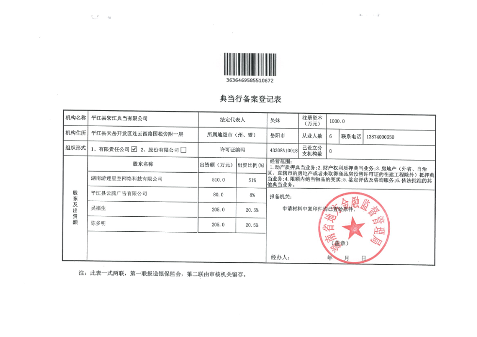 你公司上报的变更申请报告及相关材料收悉。根据《典当管理办法》和《公司法》有关法律法规的规定及岳阳市人民政府金融工作办公室的初审意见,经审核,现批复如下:
