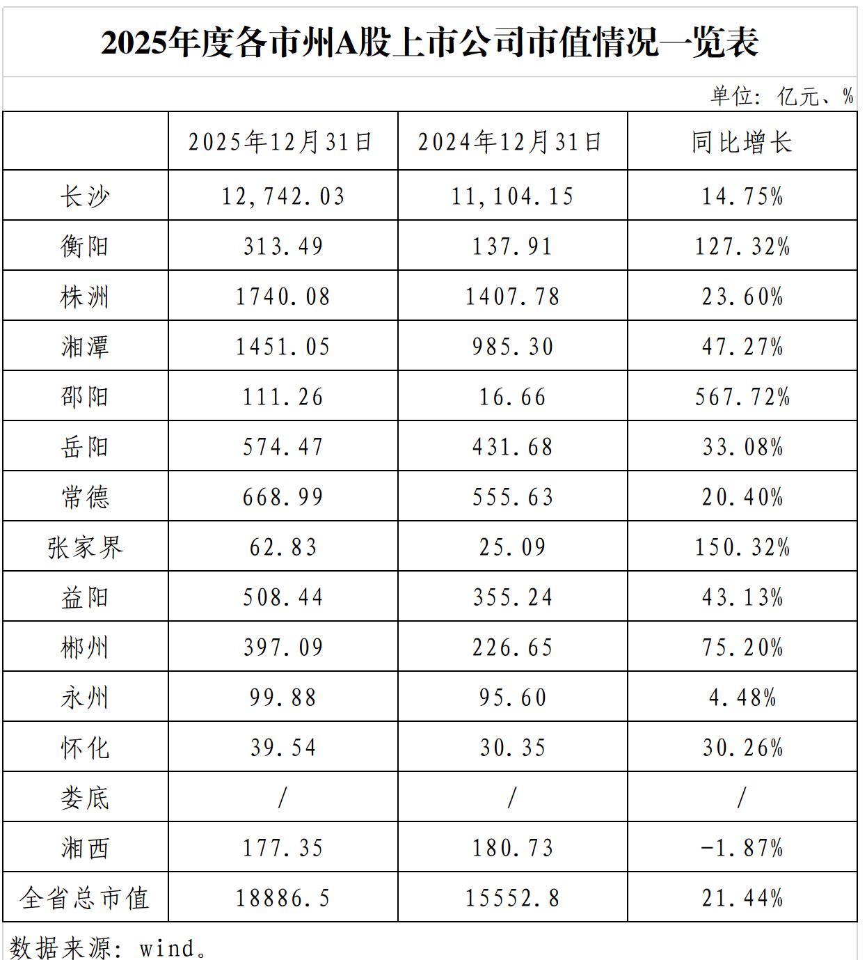 2025年度各市州A股上市公司市值情况一览表