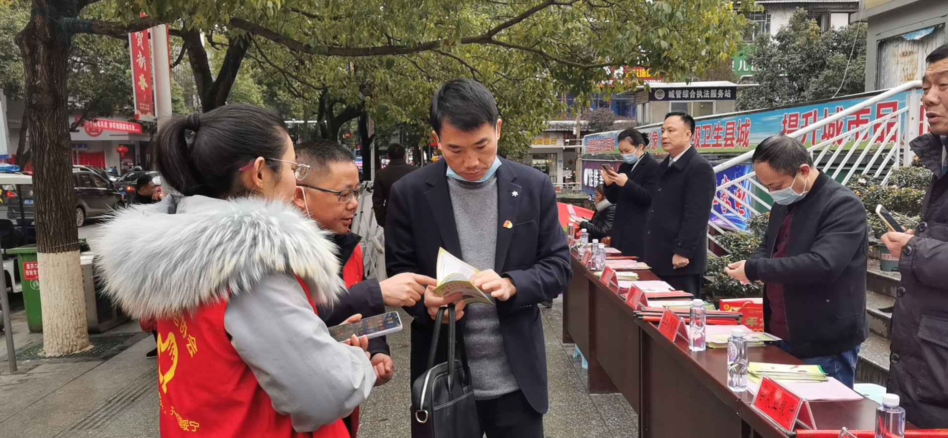 图为工作人员为群众发放宣传资料