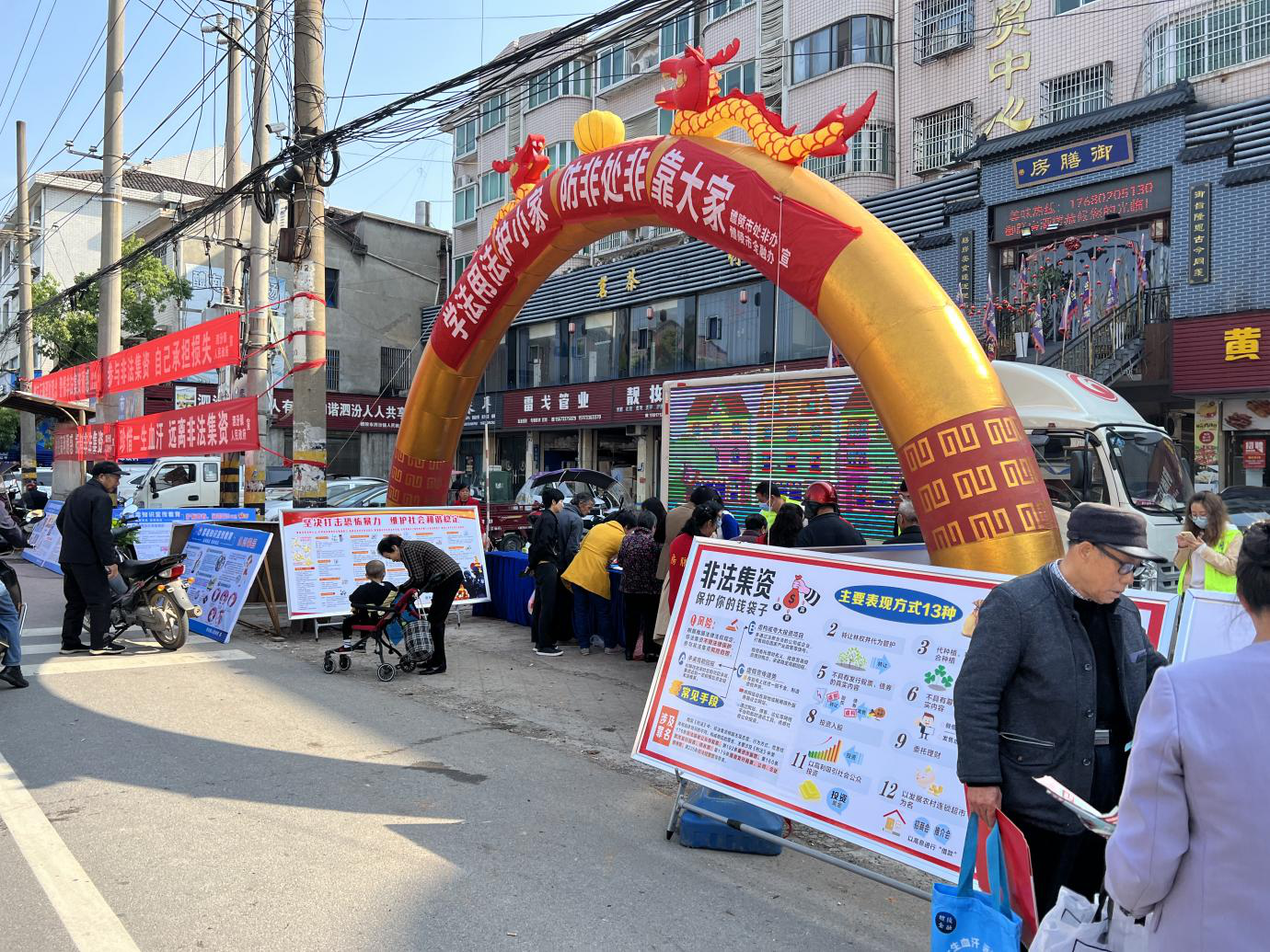 活动在镇上“赶集日”进行,现场布置了大屏幕设备,滚动播放处非宣传视频10余部;设置大型拱门1个、设置宣传台8张,悬挂宣传标语10余幅,摆放宣传展板20余块;提供相关法律咨询100余人次,对非法集资的主要特征、表现形式、常见手段以及防范对策进行解析。现场还发放宣传手册、宣传挂历、公益环保购物袋、精美礼品等,吸引市民广泛参与到宣传活动当中。为扩大宣传活动效应,此次活动会场外还出动宣传车2台,车载宣传展板和电子屏幕,播放防范非法集资提醒录音和宣传短片,在镇上主要路段和区域场所进行巡回宣传。