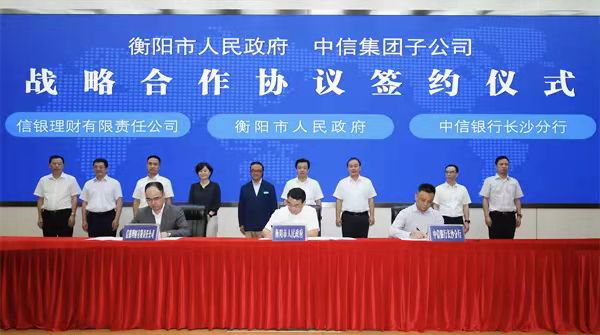 现场,衡阳市人民政府与中信银行股份有限公司长沙分行、信银理财有限责任公司签订战略合作协议,其他中信集团子公司也进行了相关项目签约。