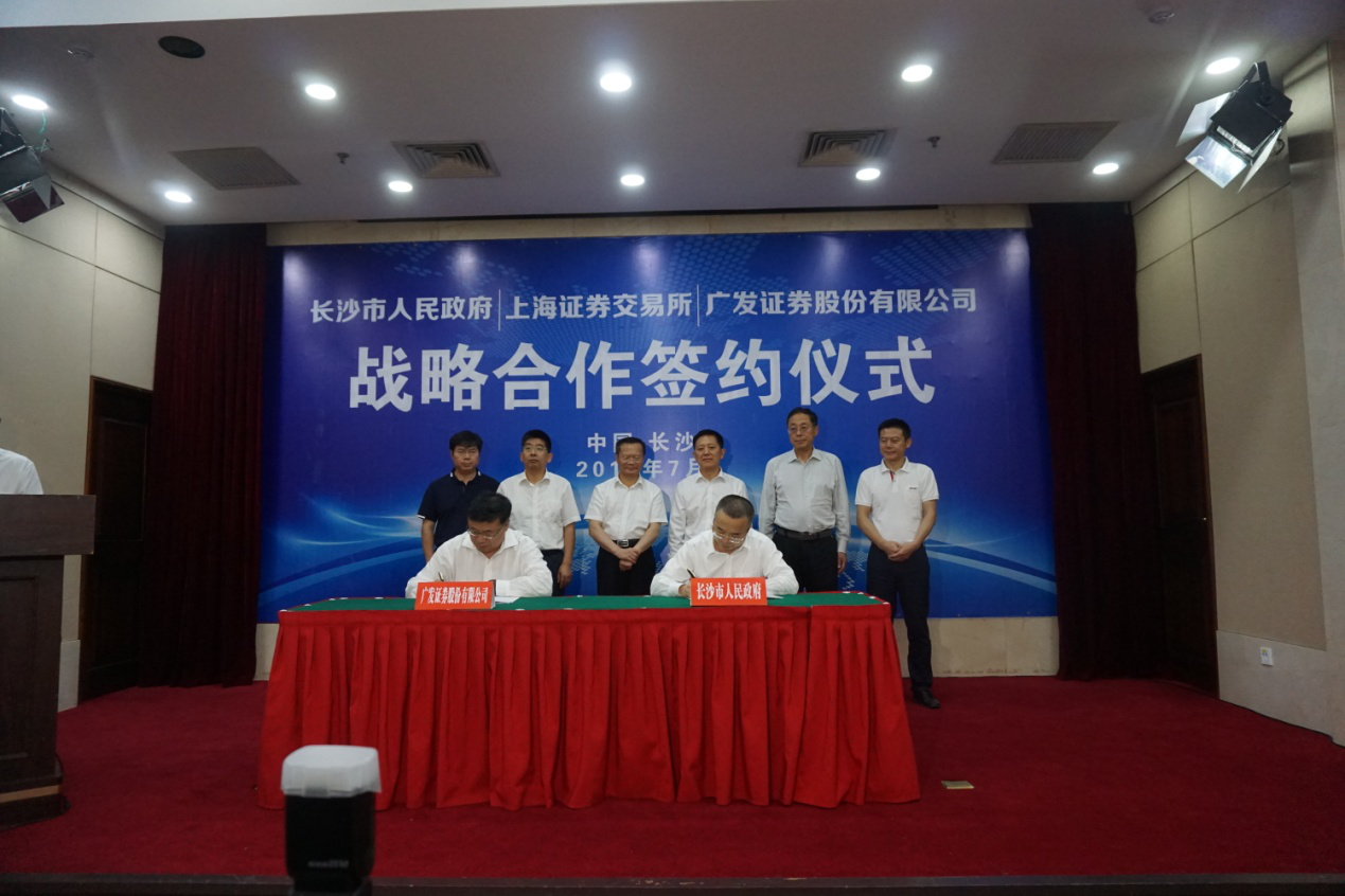 7月10日下午,长沙市人民政府举行签约仪式,分别与上海证券交易所、广发证券股份有限公司签署了战略合作备忘录与合作协议。长沙市市委副书记、市长、湖南湘江新区党工委书记胡忠雄,湖南证监局副局长李金玉,市政府秘书长张能峰出席活动,并会见了上海证券交易所监事长潘学先、广发证券董事长孙树明。长沙市委常委、副市长付胜华代表长沙市人民政府分别与上海证券交易所代表操舰(上交所发行上市中心副总监)、广发证券代表王新栋(广发证券总裁助理)进行了现场签约。