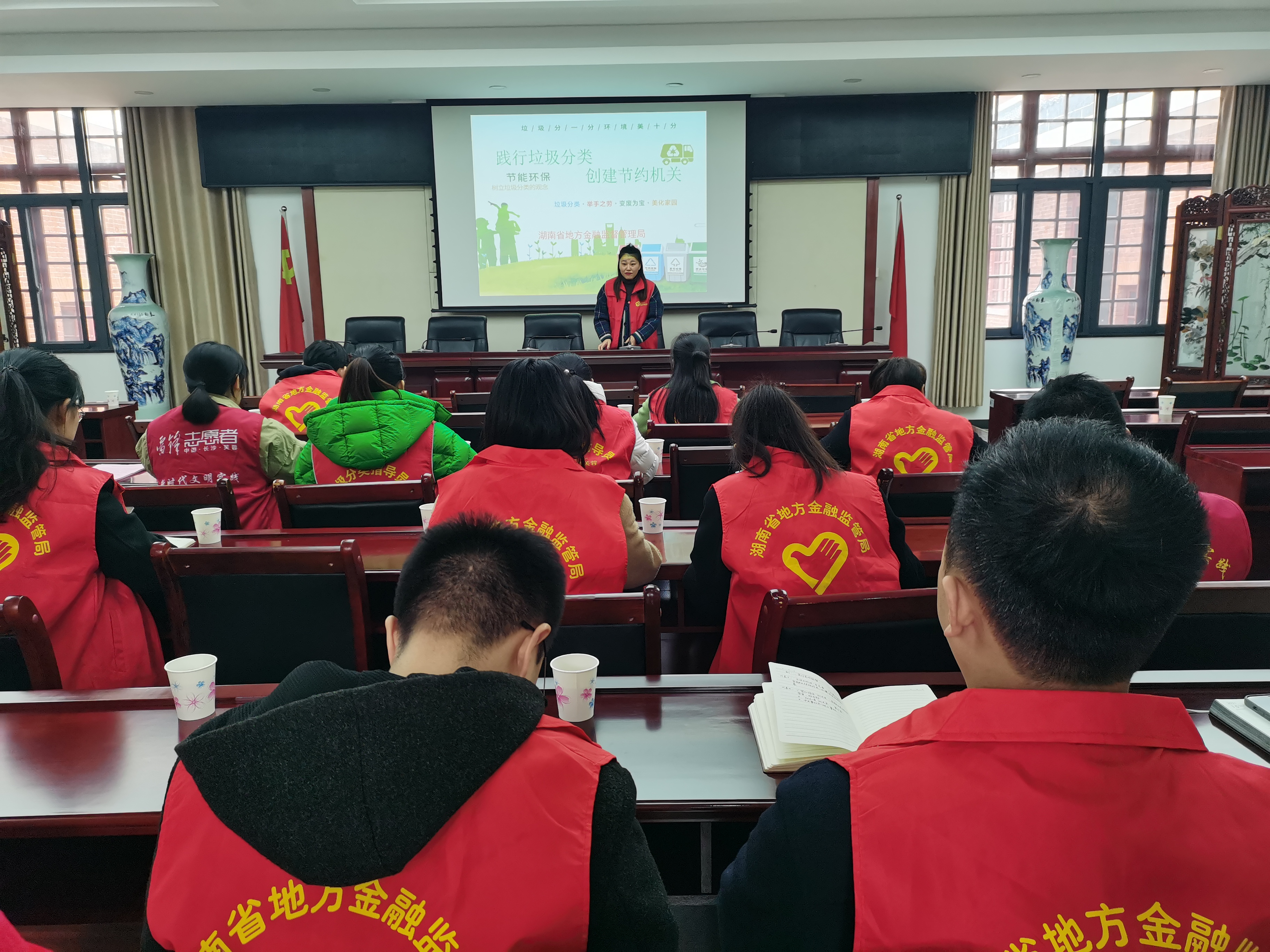 为积极创建节约型机关,进一步推进垃圾分类投放工作,12月15日,省地方金融监督管理局联合湘府社区开展垃圾分类学习培训、公益宣传、志愿者服务等系列活动。